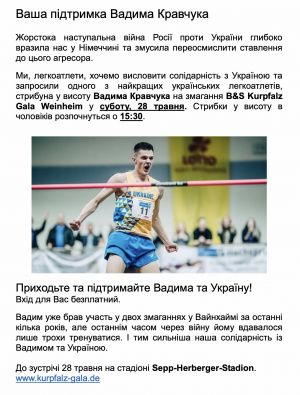 Es wurden Flugblätter in ukrainischer Sprache verfasst, um möglichst viele Landsleute über Vadims Teilnahme zu informieren. Ukrainische Staatsbürger erhalten freien Eintritt zur Kurpfalz Gala. Beginn 11:30 Uhr; Hochsprung Männer 15:30 Uhr. Karten: Kartenshop DiesbachMedien und HSC Center. Online: www.kurpfalz-gala.de (VIP Karten nur Online)