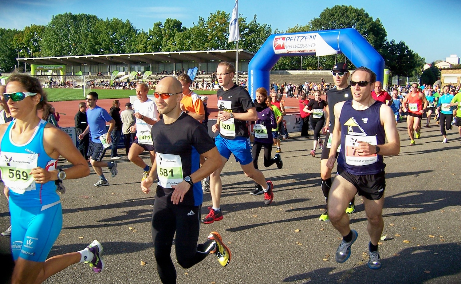 Auf eines ist beim Weinheimer Herbstlauf anscheinend immer Verlass: das Wetter. Angenehme 22 Grad brachten zu den ohnehin vielen Voranmeldungen nochmals einen enormen Nachmelderschub, so dass letztlich 721 Finisher zu verzeichnen waren; neuer Teilnehmerrekord. Bei kultigen Klängen von AC/DC wurde ein langer Laufwurm im Sepp-Herberger-Stadion auf die Reise geschickt. Die Masse der Läufer stellte für die Spitzenläufer mitunter eine Herausforderung dar, da dauerndes Überholen angesagt war, so dass es Änderungen bei der Streckenführung und der Startaufstellung geben wird.