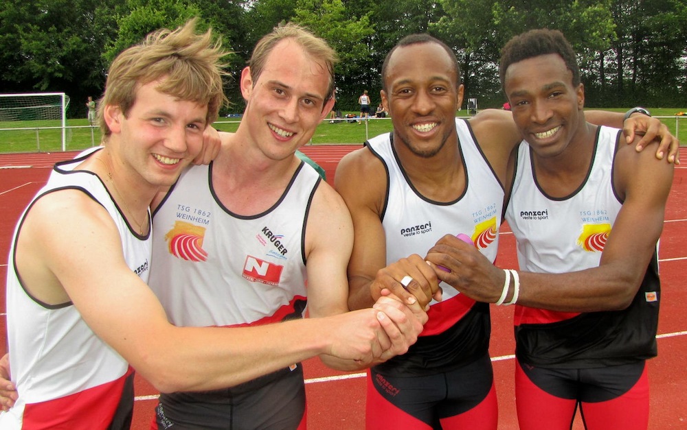 Die badischen Meisterschaften in Schutterwald brachten drei Titel für die TSG-Athleten. Erfreulich war vor allem das Diskus-Comeback von Sascha Hördt. Wegen mehrerer Fingeroperationen konnte der badische Rekordhalter lange Zeit nicht trainieren und hatte zwischenzeitlich schon an ein Karriereende gedacht. Zuletzt ließen die Beschwerden jedoch nach, so dass der Laudenbacher sich mit gezieltem Training auf den Punkt fit gemacht hat: 50,75m und der Titel waren der Lohn. Im Dreisprung der Frauen war Seriensiegerin Diana Klukas gut aufgelegt und gewann mit Saisonbestleistung von 12,49m. Bei der prestigebehafteten 4x100m-Staffel konnten die Weinheimer auf der weichen und langsamen Bahn mit LinusHackspacher, Manfred Kirchgessner, Filemon Mubiayi und Benjamin Georg überzeugen und holten in 42,74s den Titel an die Bergstraße.